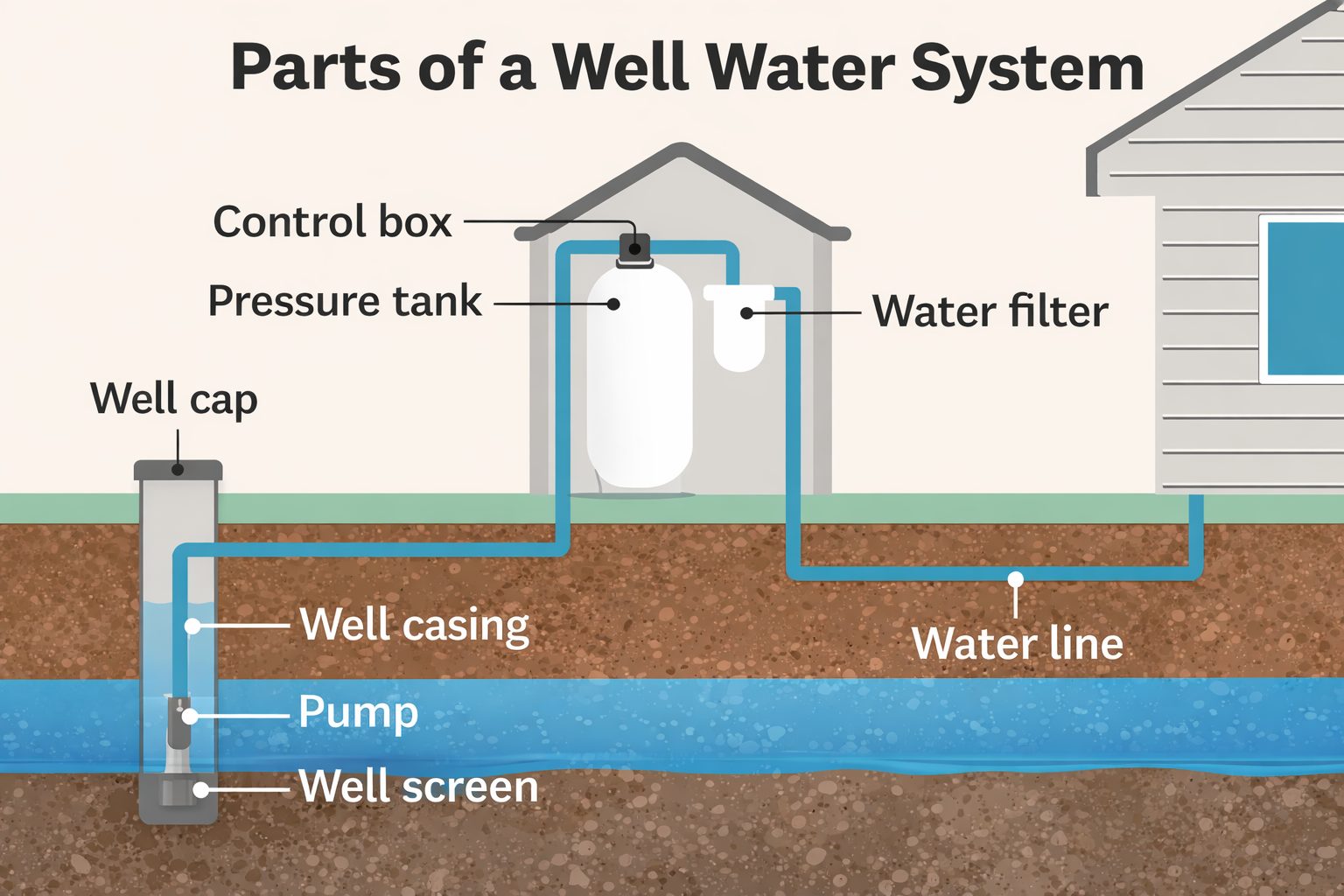 A private well system pulls groundwater from beneath your property using a drilled well and pump system.