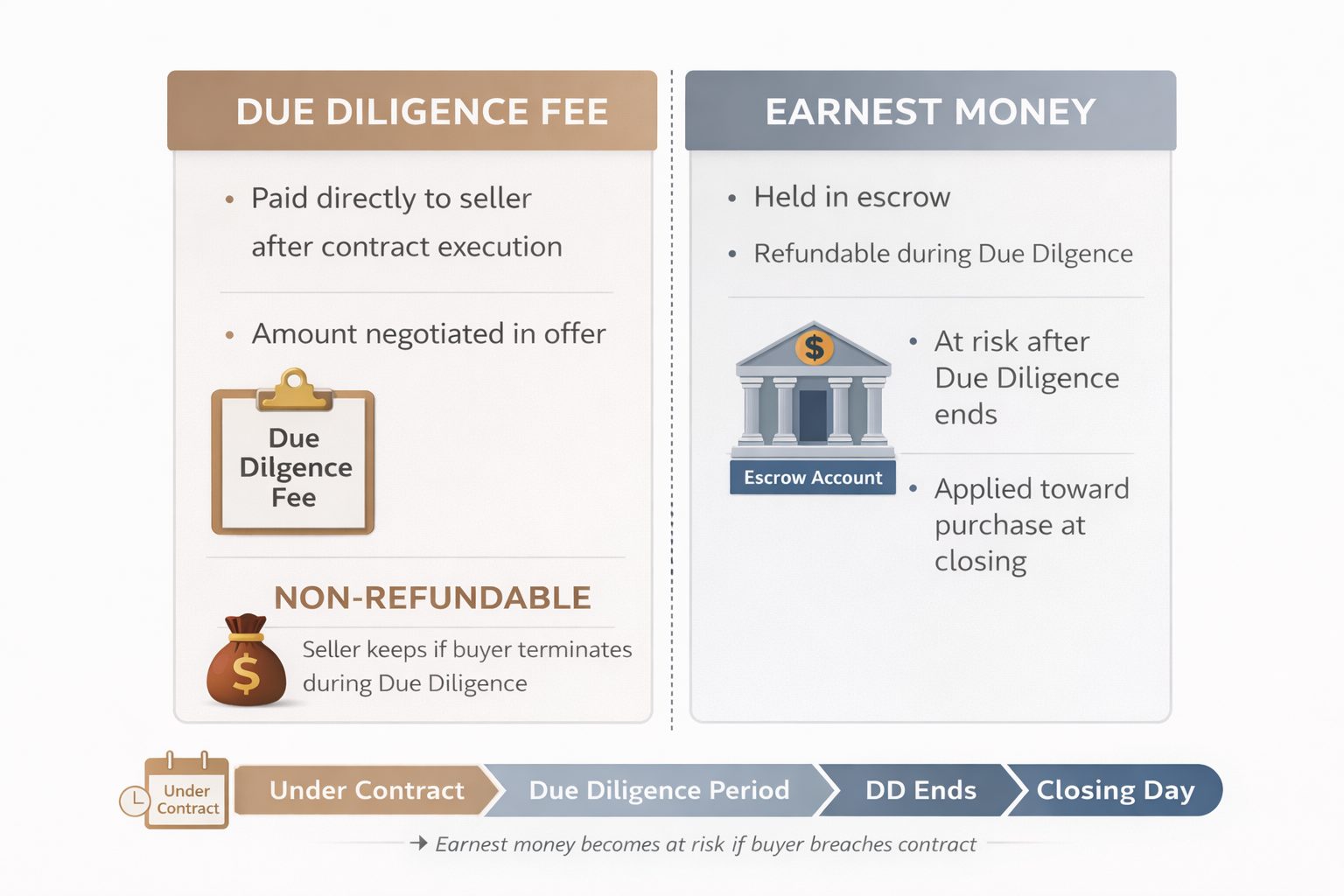 Earnest Money, by contrast, is refundable during Due Diligence but becomes exposed once that period expires.